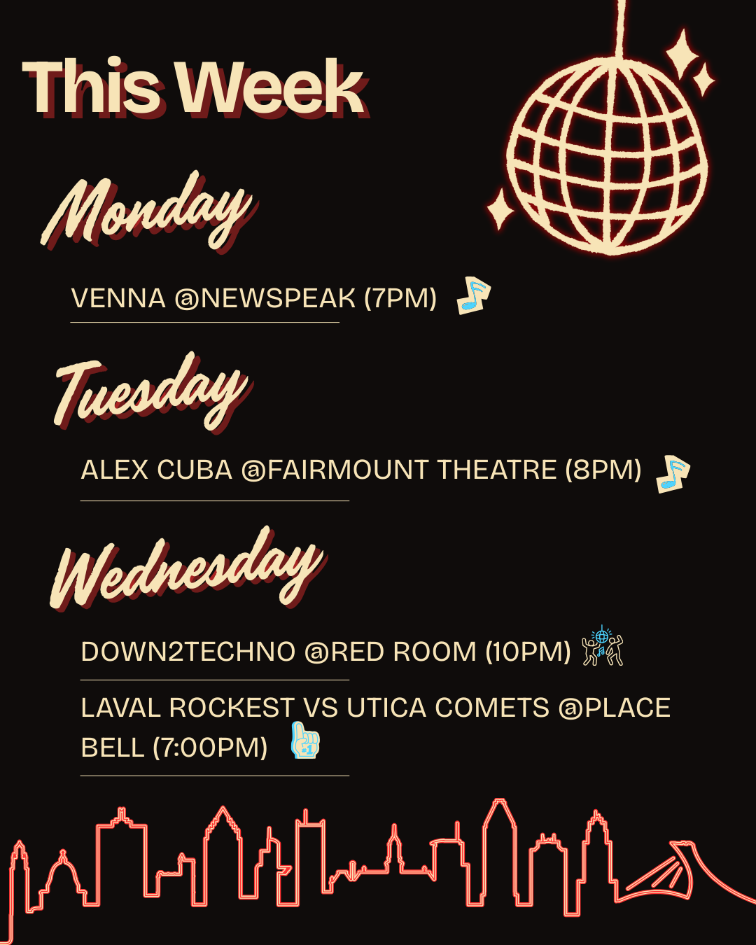 Wednesday doubles down on techno: Down2Techno at Red Room (10 p.m.), the weekly staple with complex, fast sets in a no‑frills basement, while Laval Rocket face Utica Comets at Place Bell (7 p.m.).