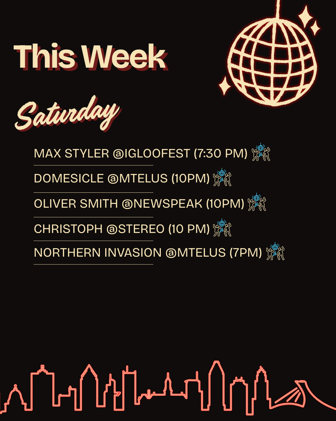 Saturday keeps the pace relentless: Max Styler headlines Igloofest (7:30 p.m.); Dômesicle at MTELUS (10 p.m.), the winter electronic festival staple; Oliver Smith at Newspeak (10 p.m.), prog trance veteran with euphoric builds; Christopo at Stereo (10 p.m.); and Northern Invasion at MTELUS (7 p.m.).