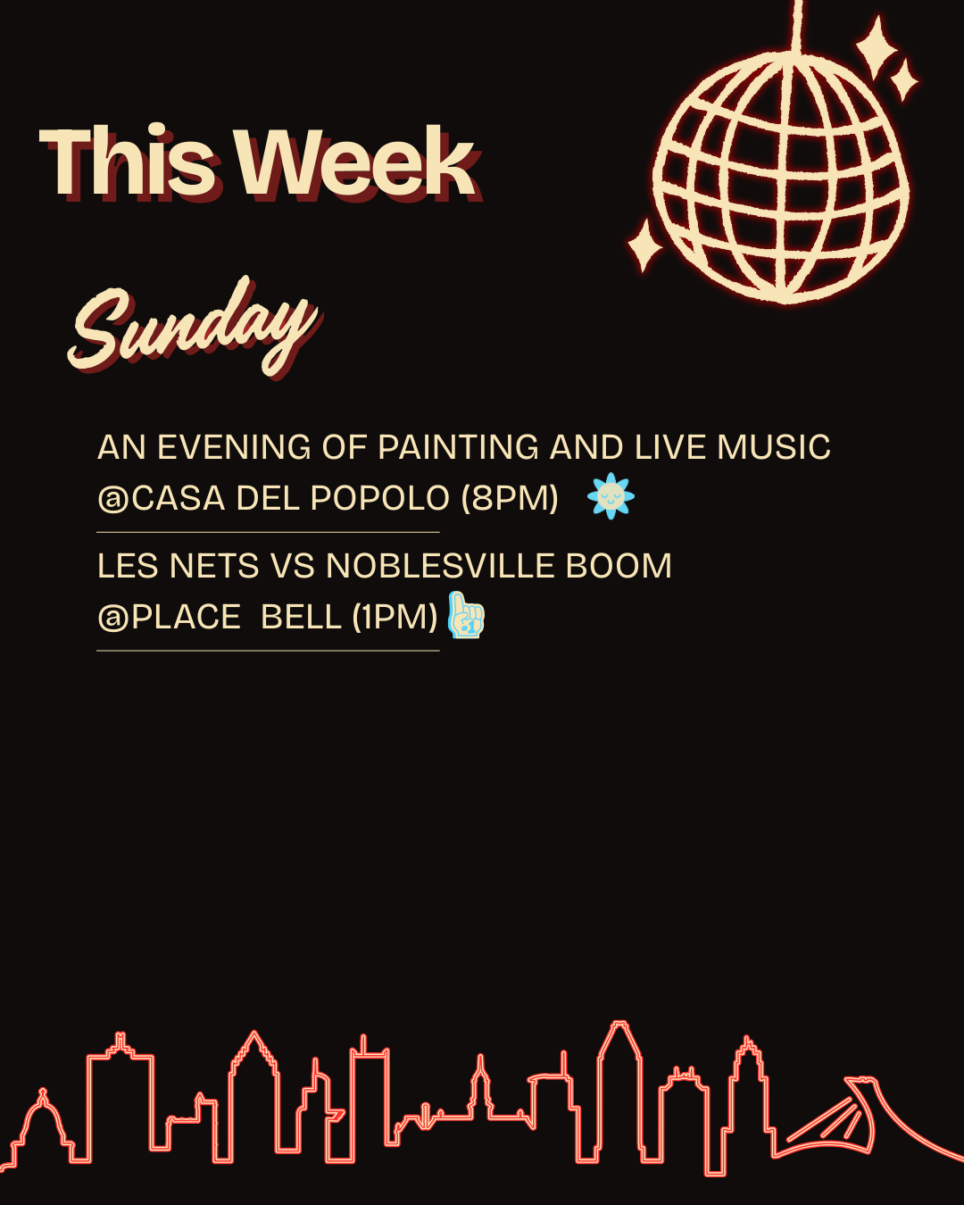 Sunday winds down with “An Evening of Painting and Live Music” at Casa del Popolo (8 p.m.) and Les Nets vs. Noble ville Boom at Place Bell (1 p.m.).