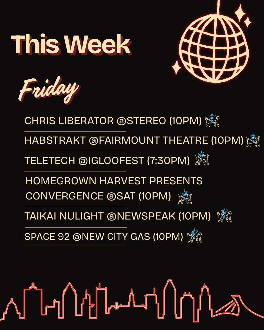 Friday overloads the options: Chris Liberator at Stereo (10 p.m.), UK hardcore legend with pounding, rave‑revival sets in the no‑phones audiophile club; Habstrakt at Fairmount Théâtre (10 p.m.), the French bass music producer dropping filthy midtempo and trap hybrids; Teletech at Igloofest (7:30 p.m.); Homegrown Harvest Convergence at SAT (10 p.m.); Taika Nuight at Newspeak (10 p.m.); and Space 92 at New City Gas (10 p.m.), the French techno trio known for hypnotic, acid‑infused loops in a massive warehouse.